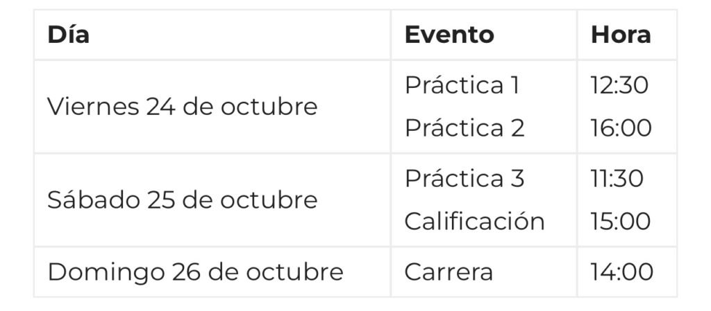 Los eventos del FORMULA 1 GRAN PREMIO DE LA CIUDAD DE MÉXICO 2025 Presentado por Heineken son: