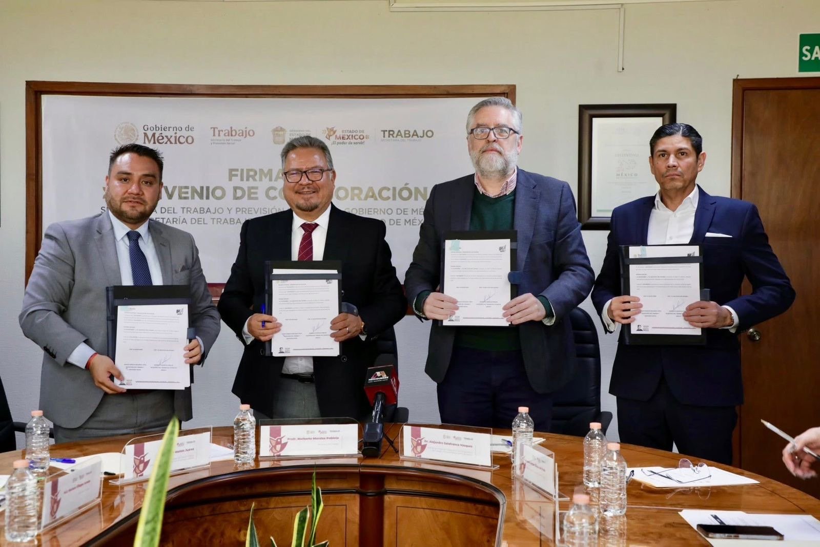 La firma del acuerdo fue encabezada por el secretario del Trabajo del Estado de México, Norberto Morales Poblete, y el Dr. Alejandro Salafranca Vázquez, jefe de la Unidad de Trabajo Digno, en representación del secretario del Trabajo y Previsión Social del Gobierno de México, Marath Bolaños López.