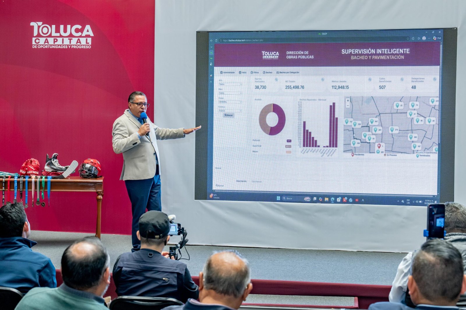Durante la conferencia La Toluqueña, el Presidente Municipal explicó que derivado de que la carpeta asfáltica se encuentra en malas condiciones y se tenía un registro 180 mil baches sumados a los que se abren por la temporada de lluvias, el Gobierno municipal mantiene acciones permanentes para lograr que, en poco más de un año, se realice cerca del 45% de los trabajos que se llevaron a cabo en toda la pasada administración.
